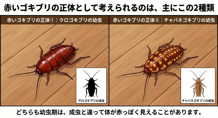 結論から言うと、その赤いゴキブリの正体は、クロゴキブリの幼虫か、あるいは繁殖力が非常に強いチャバネゴキブリの可能性があります。