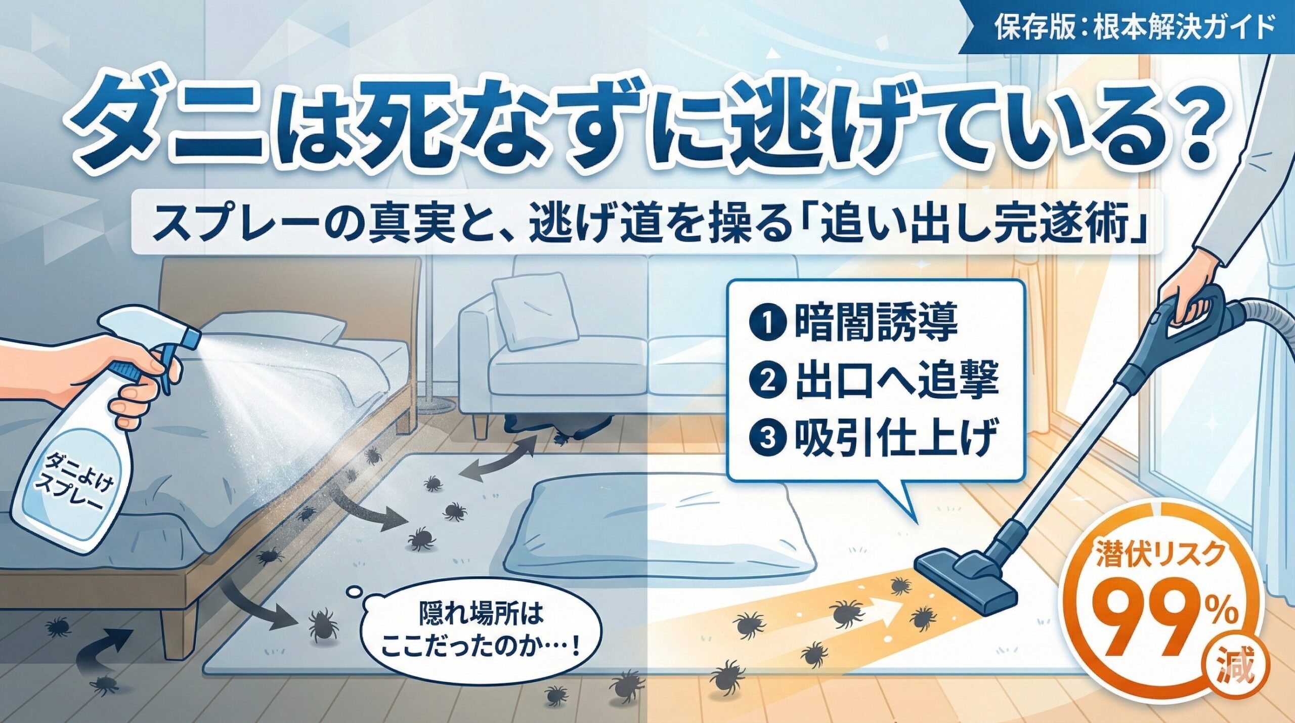 ただ闇雲にスプレーを撒くのではなく、ダニの習性を理解し、彼らの動きをコントロールすることで、効果は何倍にも高まります。