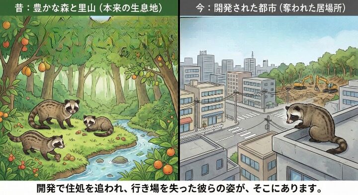 ハクビシンがかわいそうと言われる最大の理由は、彼らがもともと暮らしていた森や里山が、人間の開発によって奪われてしまったことにあります。